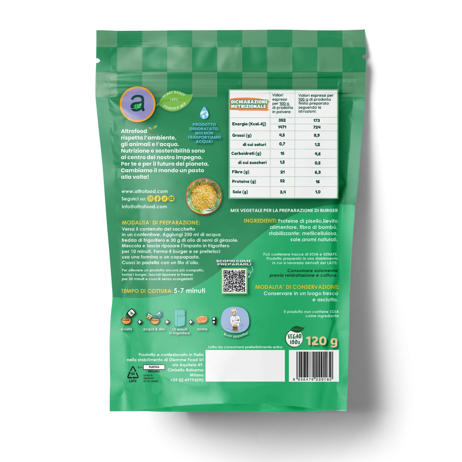 Scopri il gusto unico di ALTRO BURGER MIX: il preparato Plant Based ideale per un burger alternativo al gusto autentico del pollo. L'alternativa alla carne, buona e sostenibile e senza glutine.