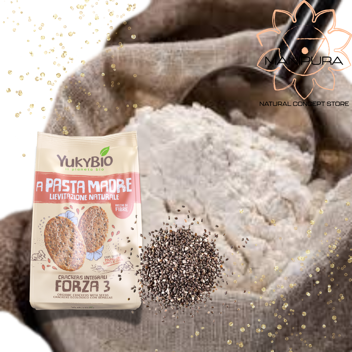 Semi di Chia, di Lino scuri e di Papavero! Questo mix di semi si intreccia nell’impasto con lievito A Pasta Madre che dà vita ai delicati Crackers Forza 3 dal gusto rustico e irresistibile!