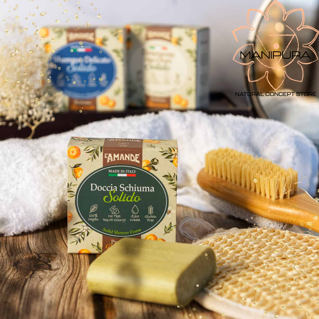 Doccia schiuma solido dal profumo agrumato con oli essenziali italiani bio di mandarino e arancia amara, amido di mais e burro di karité. Profumo agrumato fresco tipicamente Italiano. Con oli essenziali Italiani Bio di Mandarino e Arancia Amara, amido di Mais e burro di Karité.