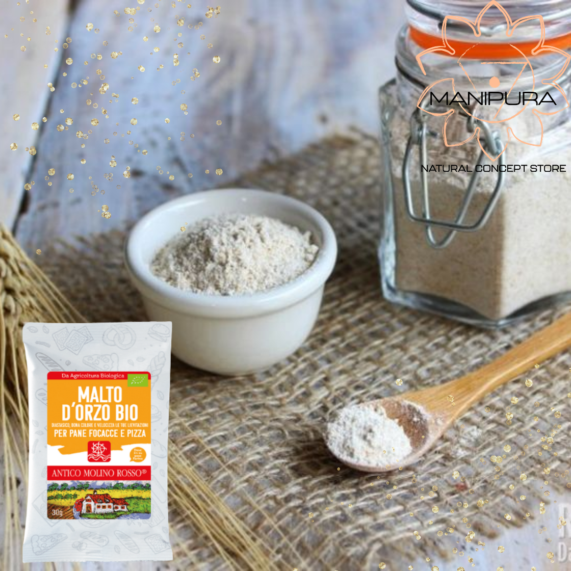 Malto d’orzo in polvere da agricoltura biologica. Il Malto d’orzo è un miglioratore per panificazione ricco di zuccheri complessi e di enzimi che favoriscono l’attività di lievitazione riducendo le problematiche legate ai mesi più freddi. Rende la superficie del pane dorata e croccante, inoltre migliora il gusto e rende pizze e pani più saporiti.