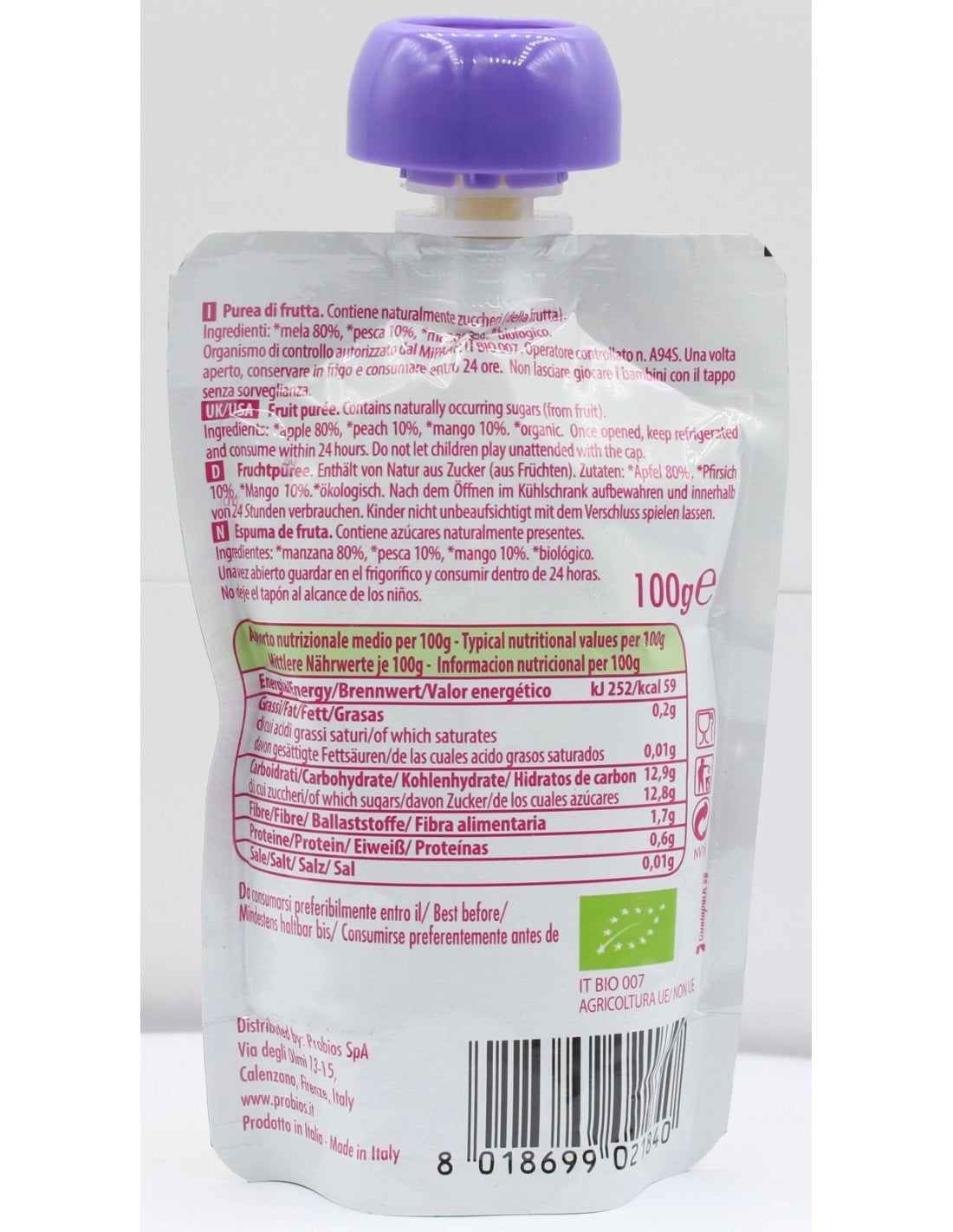 Mela* 80%, pesca* 10%, mango* 10%. *biologico.
