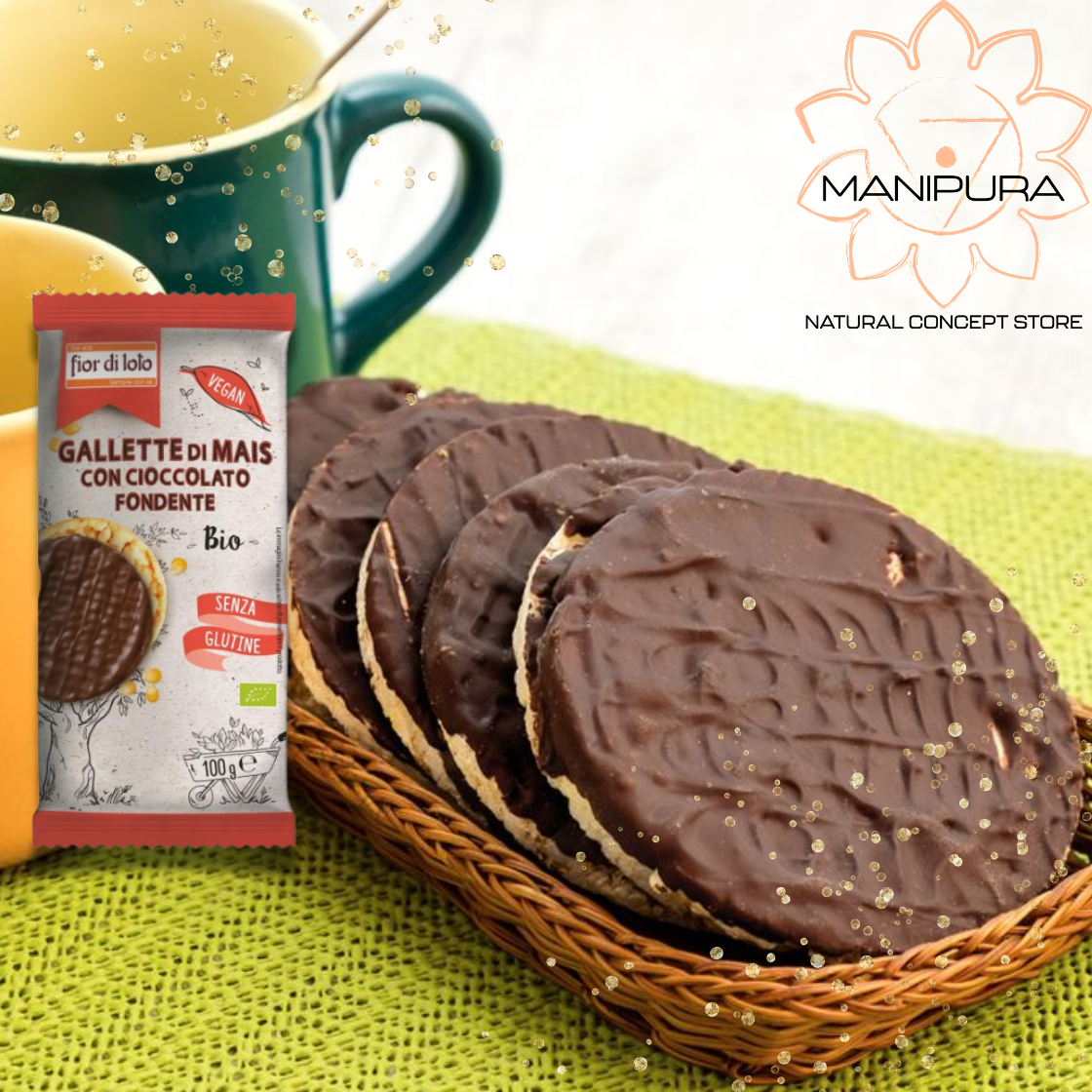 Gallette di mais ricoperte di cioccolato fondente biologiche Prodotto biologico senza glutine specificamente formulato per celiaci