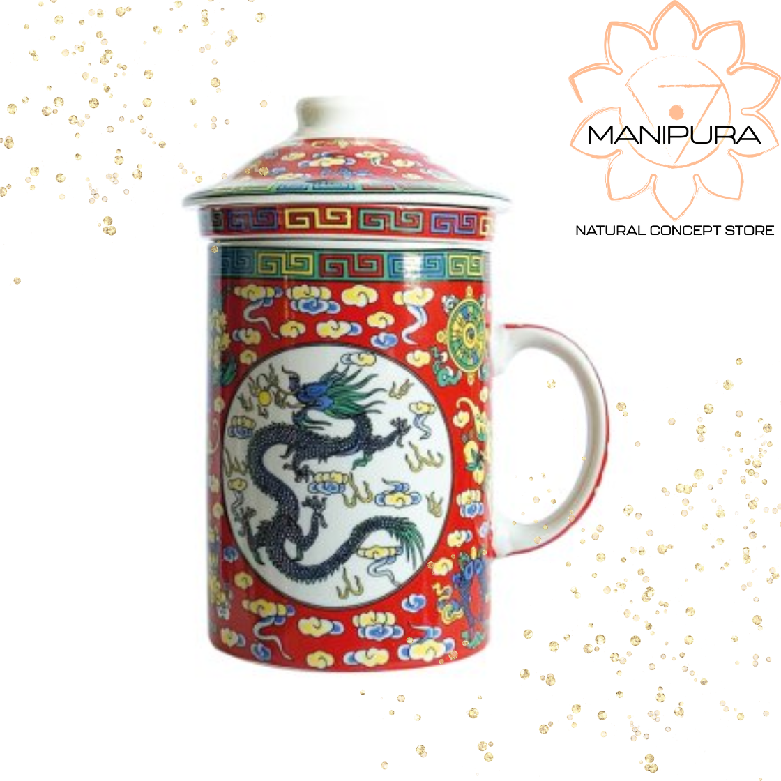 Tazza da tè decorata a mano come le antiche porcellane cinesi, completa di filtro in porcellana e coperchio.
