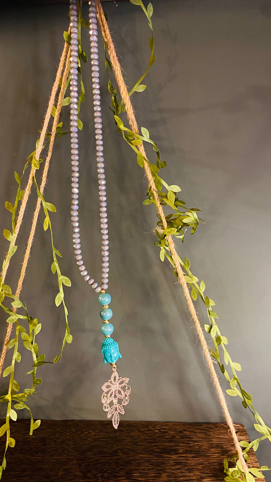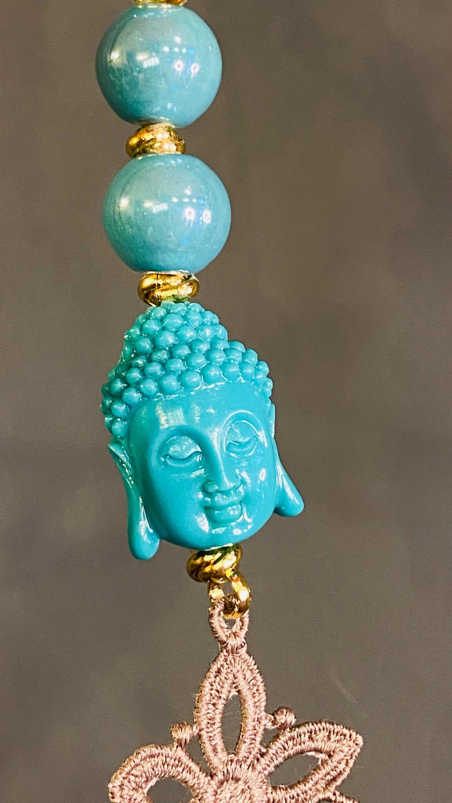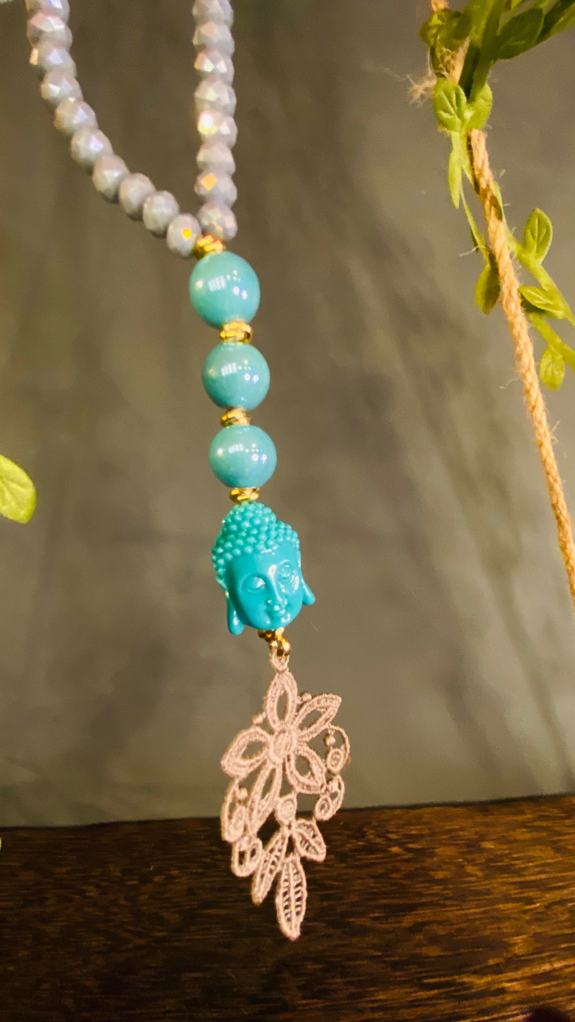 Mala realizzato con pietre dure sfaccettate che riflettono la luce con delicati bagliori. Al centro, sfere turchesi lucide con dettagli dorati, una testa di Buddha in resina e un elegante pendente mandala argentato. Un gioiello unico, simbolo di equilibrio, pace e consapevolezza.