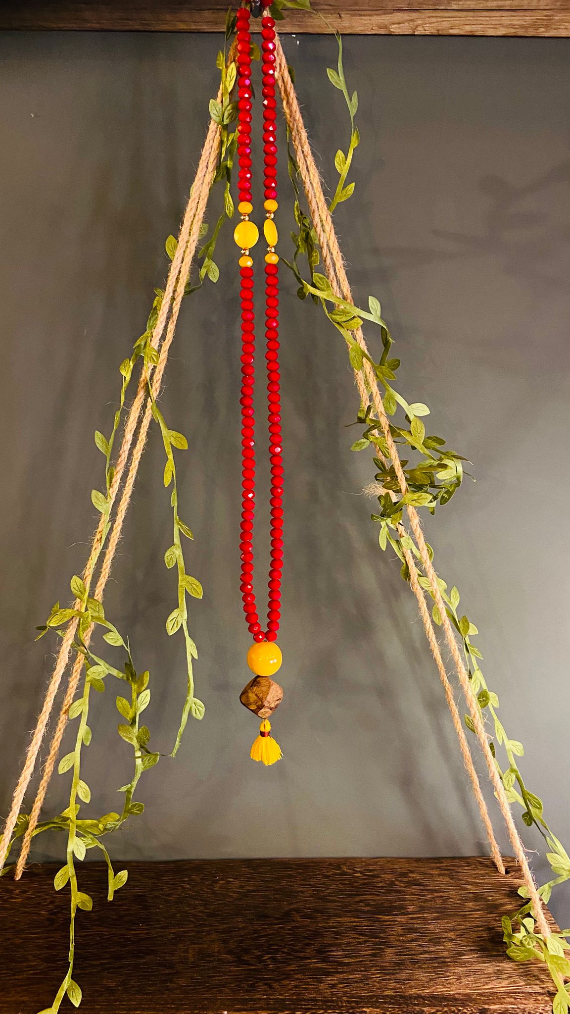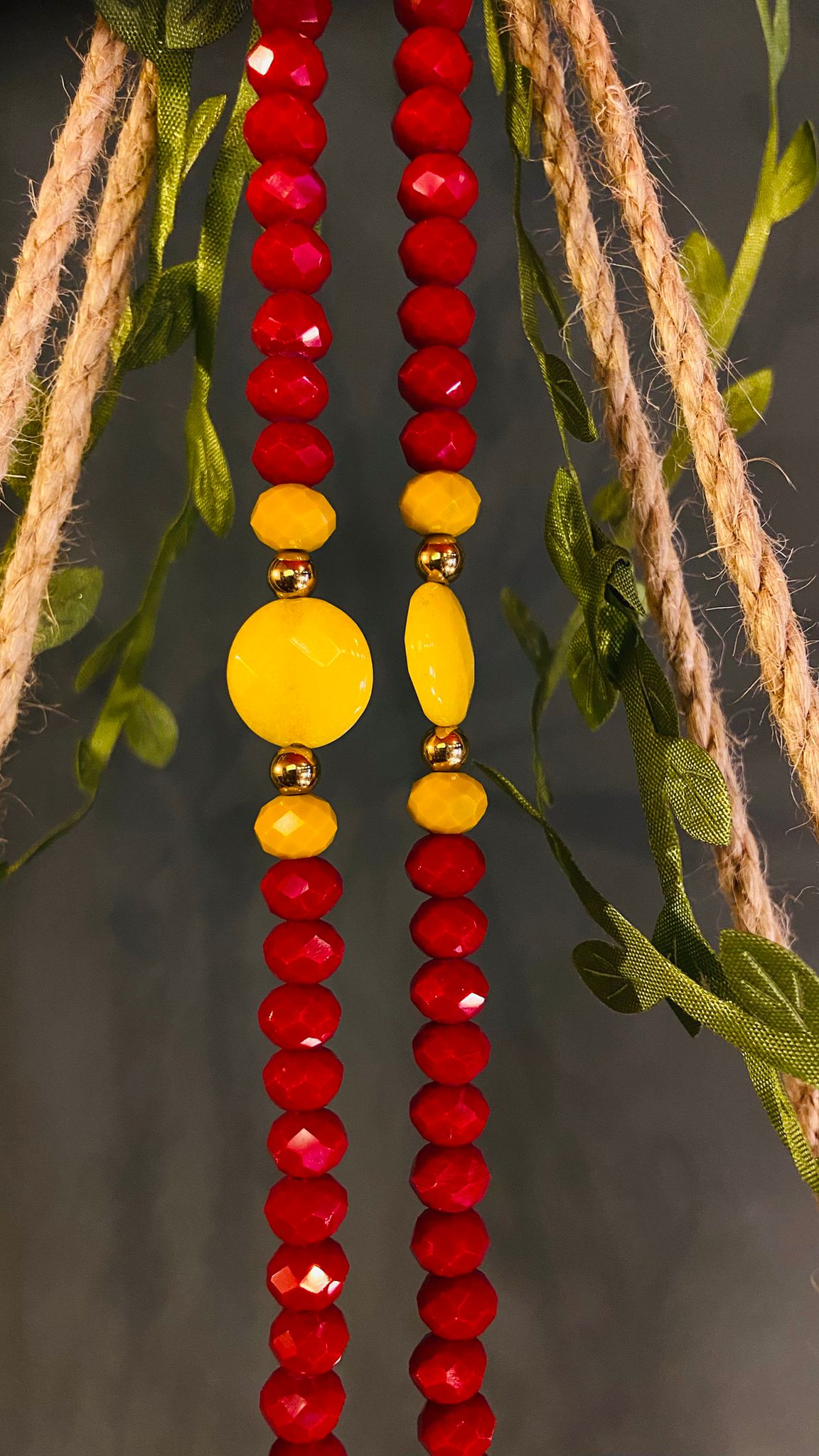 Mala realizzato con pietre dure rosse sfaccettate che catturano e riflettono la luce con intensità e vitalità. Al centro, una grande sfera gialla senape che irradia calore e positività, accompagnata da un elemento in legno naturale sfaccettato. A completare il design, una nappa senape che dona armonia e movimento. Un gioiello artigianale che unisce energia, radicamento e luce.