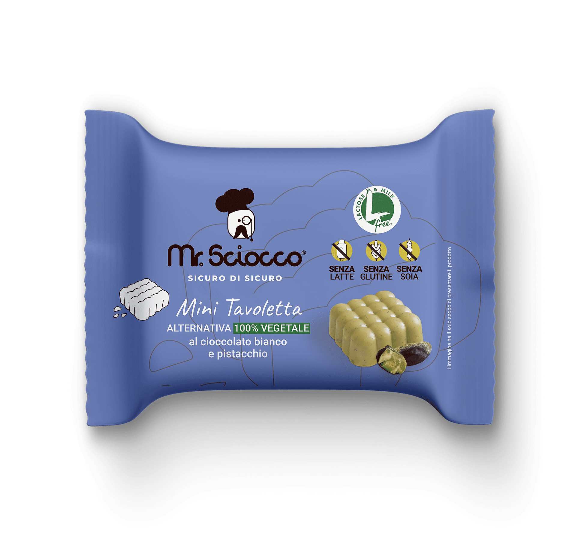 Le Mini Tavolette Mr.Sciocco sono completamente prive di tracce di lattosio, proteine del latte, glutine e soia, quindi adatte a persone con intolleranza al lattosio, allergia alle proteine del latte, sensibilità al glutine, o che seguono una dieta vegana. Può contenere tracce di altra frutta a guscio e arachidi. Il cubo contiene 12 mini tavolette confezionate singolarmente in bustine in carta.