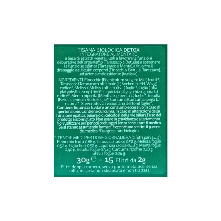 Tenori medi per dose giornaliera (2 filtri pari a 4 g): finocchio frutti 0,88 g, Tarassaco radice 0.52 g, Melissa foglie 0.52 g, Tiglio fiori 0.52 g, Liquirizia radice 0.48 g, Menta foglie 0.40 g, Betulla foglie 0.36 g, Curcuma rizoma 0.28 g, Stevia foglie 0.04 g.