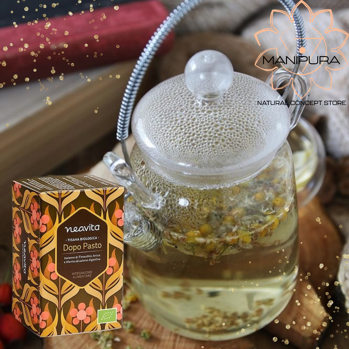 Tisana biologica Dopo Pasto a base di estratti vegetali di Finocchio, Anice e Menta piperita utili a sostenere la funzione digestiva.