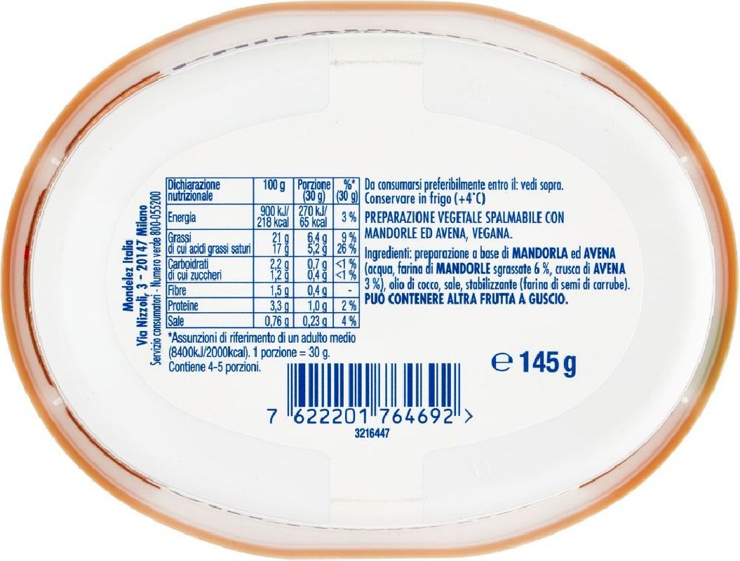 Ingredienti: acqua, farina di mandorle sgrassate 6%, crusca di avena 3%, olio di cocco, sale, stabilizzante (farina di semi di carrube).