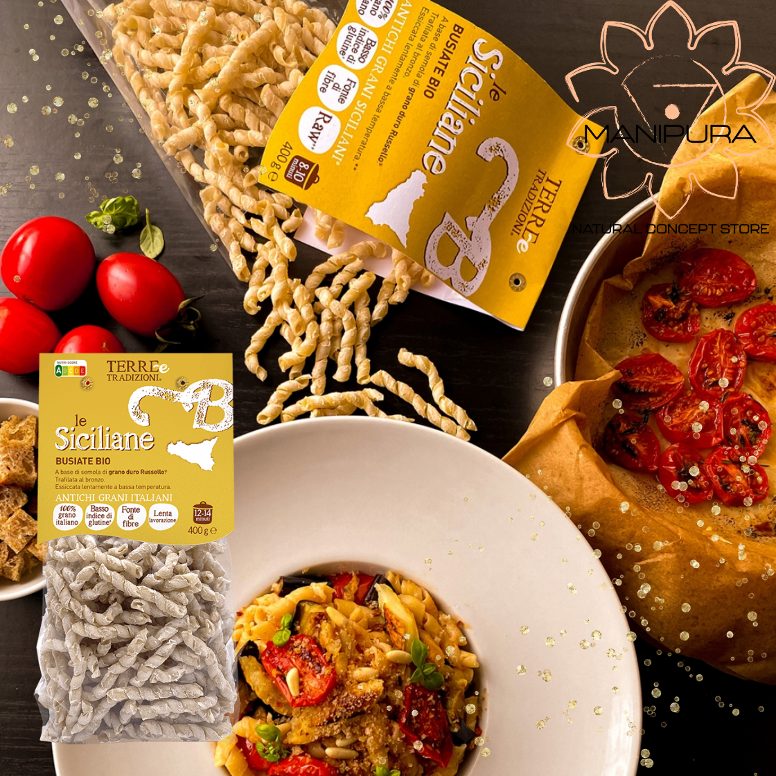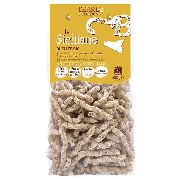 Le Busiate Bio di Terre e Tradizioni, sono un formato di pasta tipica trapanese e appartengono alla linea Le Siciliane, paste regionali, realizzate con semola di Grano Duro Russello da agricoltura biologica e coltivato in Sicilia, trafilate al bronzo ed essiccate lentamente a bassa temperatura.