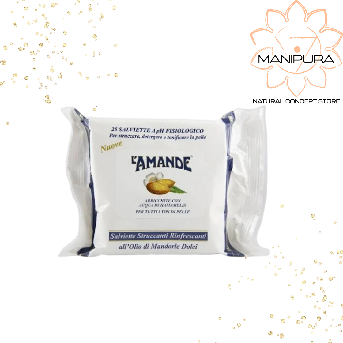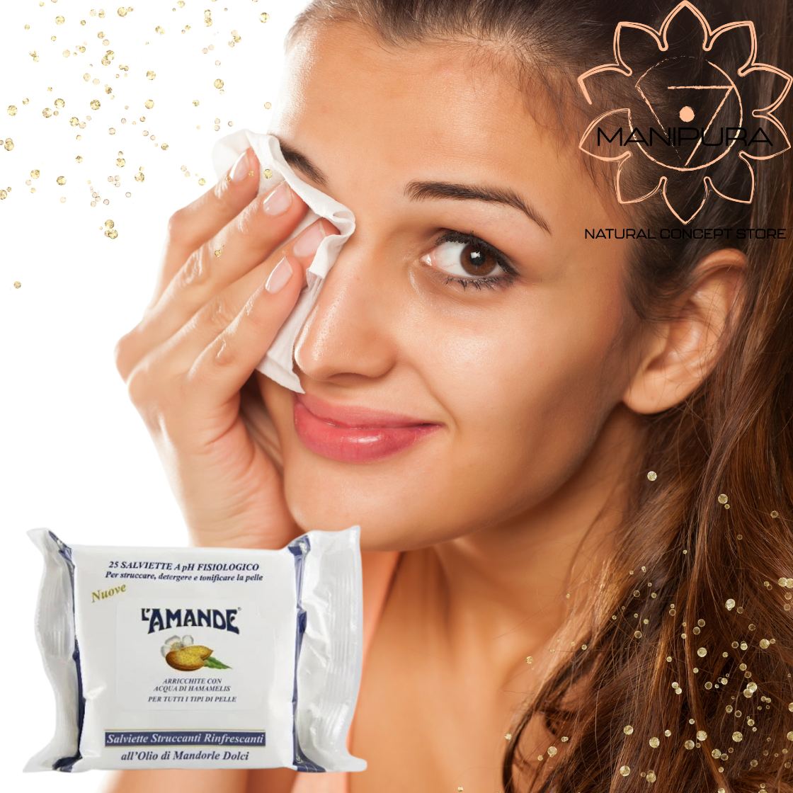 salviette struccanti realizzate in morbido tessuto alveolato. La particolare formulazione arricchita con l'olio di mandorle dolci, l'acqua di hamamelis ed il bisabololo (principio attivo emolliente della camomilla) aiuta ad eliminare le impurità e rimuovere ogni traccia di trucco con delicatezza, lasciando la pelle morbida e tonificata.