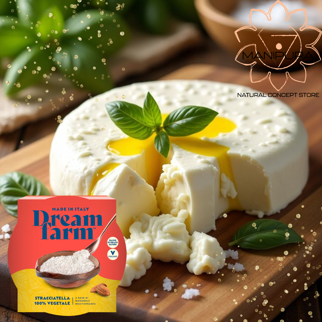 Stracciatella 100% vegetale, realizzata da Dream Farm con ingredienti naturali: preparato di mandorla (acqua, mandorle 18%, anacardi), fibre vegetali (mais, cicoria, Plantago Ovata), sale, aroma naturale, fermenti lattici vegetali, stabilizzante: agar-agar. Può contenere tracce di: nocciole, pistacchi.