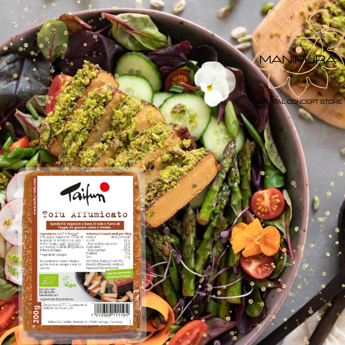 Tofu* 93% (SOIA* 55%, acqua, coagulante: cloruro di magnesio, solfato di calcio), salsa di soia* (acqua, SOJA*, FRUMENTO*, sale marino), fumo da sfregamento di legno di faggio.